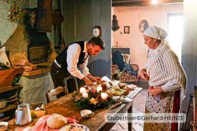 Wenn man das große Freilichtmuseum betritt, wirkt es, als sei die Zeit stehen geblieben. Die Fachwerkhäuser sind festlich geschmückt, Weihnachtsbäume stehen vor den Höfen, und aus den Küchen duftet es nach traditionellen Rezepten. Besucher können erleben, wie früher gebacken, erzählt und gefeiert wurde – mit echten regionalen Bräuchen und authentischen Darstellungen.