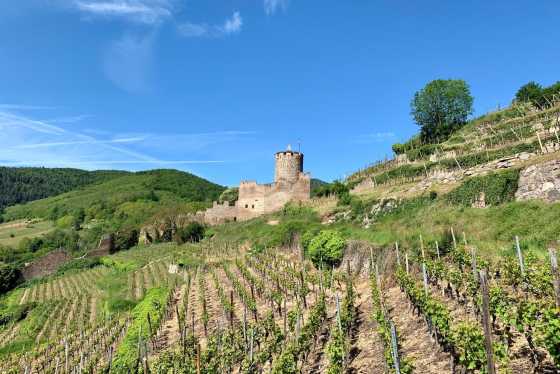 Die Burgruine oberhalb der Stadt bietet einen weiten Blick über Weinberge, Dächer und das Tal der Weiss – besonders lohnend bei klarem Wetter.
