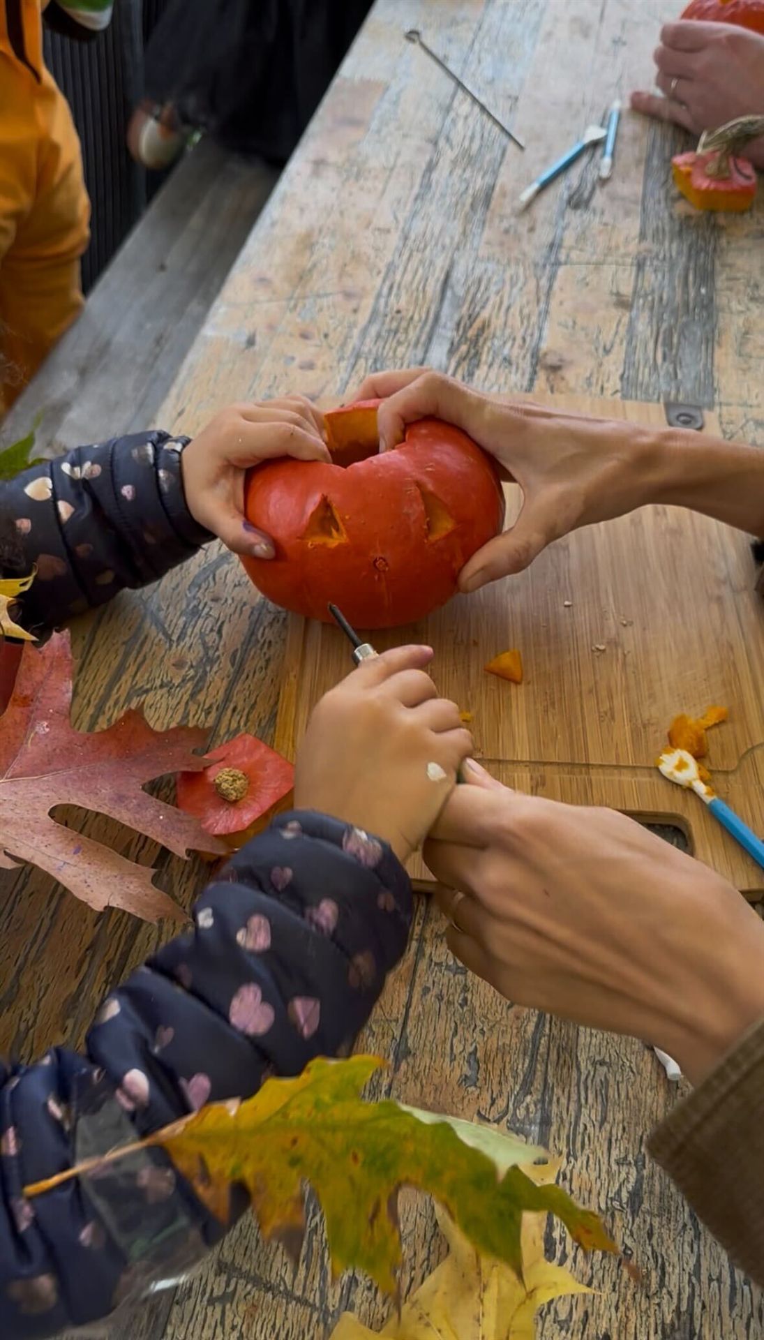 Unter Anleitung einer Betreuerin lernen die Kinder, ihre Kürbisse mit den bereitgestellten Werkzeugen auszuhöhlen und zu schnitzen. Dabei können sie ihrer Fantasie freien Lauf lassen und Gesichter oder herbstliche Motive gestalten, die sie anschließend mit nach Hause nehmen dürfen.